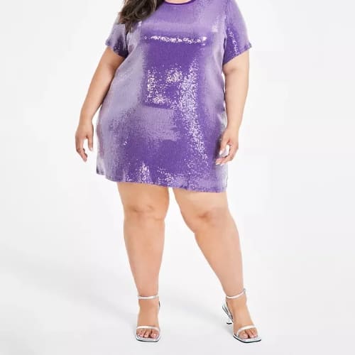 This dress sparkles with bold print and subtle sequins, offering a festive yet wearable look for curves.